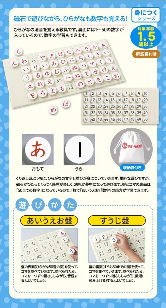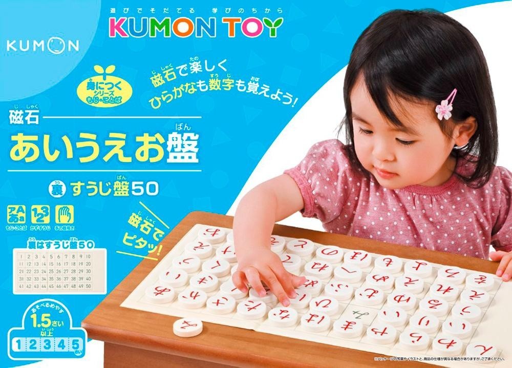 | ひらがなが書かれた磁石のコマを、ひらがな50音が書かれている盤に並べていく、くもん独自の「磁石あいうえお盤」です。盤とコマの裏面は「50までの数字」になっているので、1枚で「あいうえお」「数字」の両方が学習できます。 |