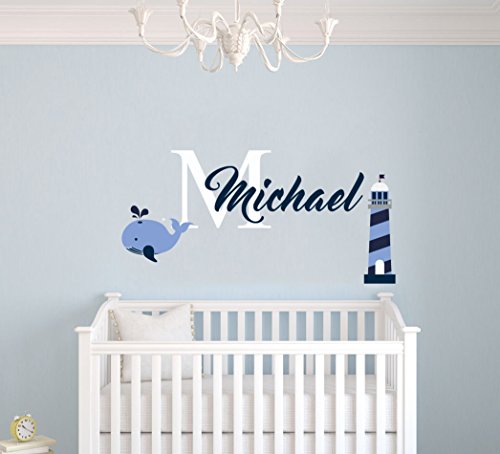 Custom Name Lighthouse And Whale Animal Series - Nautical Theme - Baby Boy - Wall Decal Nursery For Home Bedroom Children (MM12) (Wide 30"x15" Height)