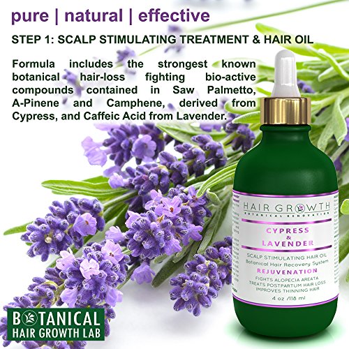 STEP 1 Hair Growth Pre-Shampoo Scalp Stimulating Treatment and Hair Rejuvenation Oil includes the strongest known botanical hair-loss fighting bio-active compounds contained in Saw Palmetto, A-Pinene and Camphene, derived from Cypress, and Caffeic Acid from Lavender