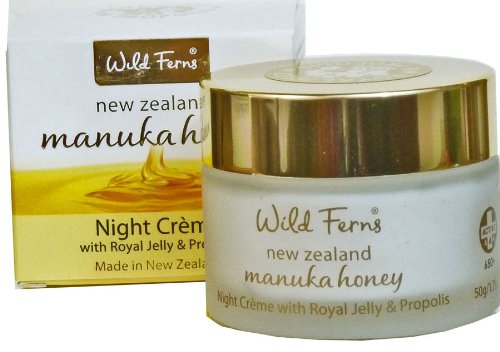 -. Binding : Misc. -. Brand : Wild Ferns -. EAN : 9415293228245 -. Feature : Made with active manuka honey, Royal Jelly and Propolis / Glass Jar 50gr/1.76 oz / Made in New Zealand using pure unadulterated Active Manuka Honey of the highest quality / Cruelty free, paraben free, no mineral oil -. Label : Parrs Skincare New Zealand -. Manufacturer : Parrs Skincare New Zealand -. NumberOfItems : 1 -. PackageQuantity : 1 -. ProductGroup : Beauty -. ProductTypeName : BEAUTY -. Publisher : Parrs Skincare New Zealand -. Studio : Parrs Skincare New Zealand -. Title : Wild Ferns Gold Night Cream in Glass Jar with Royal Jelly and Propolis