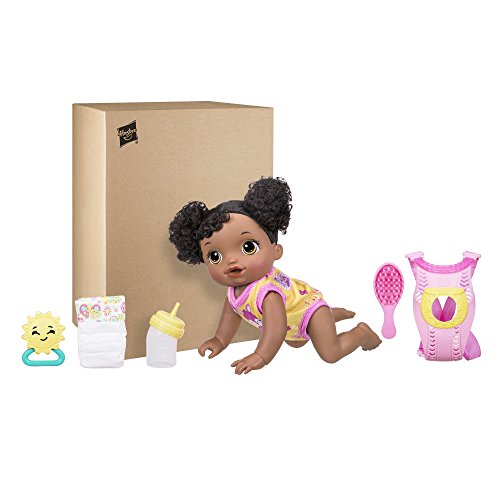 There’s many ways to play with the Baby Go Bye Bye doll! Better keep an eye on her…because she crawls and talks -- wow, watch her go! Mommies can tickle her tummy and she crawls over. Shake her adorable rattle and she crawls when she hears it. Girls can take her along in the included carrier for on-the-go adventures. Also, feed her by filling her bottle with tap water…and, ut oh! Change her diaper after she wets! Talk to her and she’ll babble back -- she speaks over 30 sounds and phrases in English or Spanish to share lots of lively and giggly moments with Mommy. Brush and style her rooted hair before and after she crawls too. It’s a fun day of play while taking care of baby! Baby Alive and all related properties are trademarks of Hasbro.Feature
