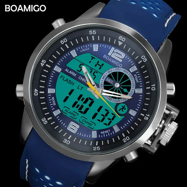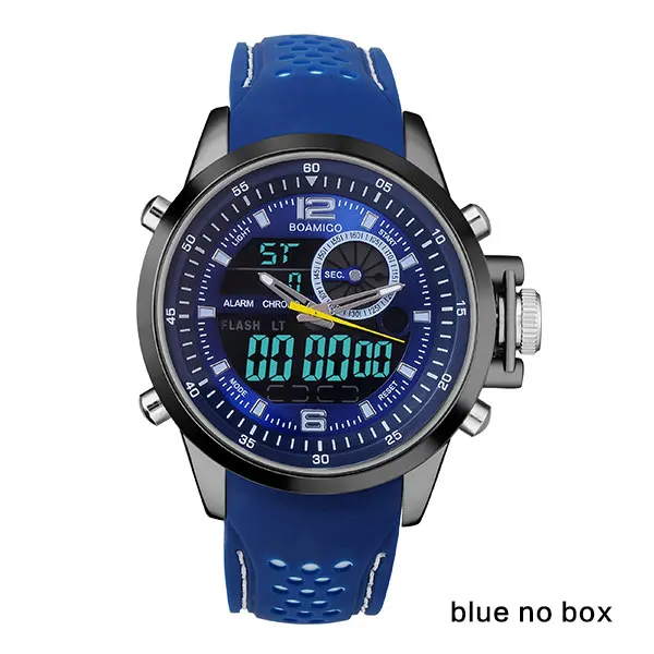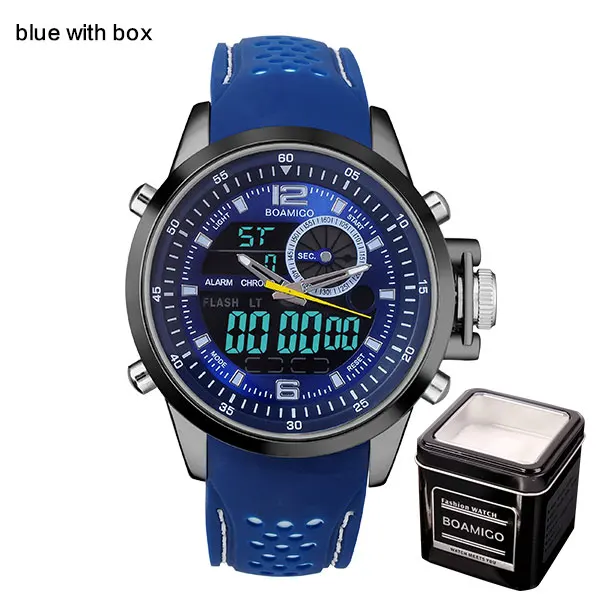 | [해외] 남성 듀얼 디스플레이 스포츠 시계 군사 쿼츠 시계 고무 밴드 BOAMIGO 브랜드 블루 LED 아날로그 디지털 손목 30 메터 방수 |