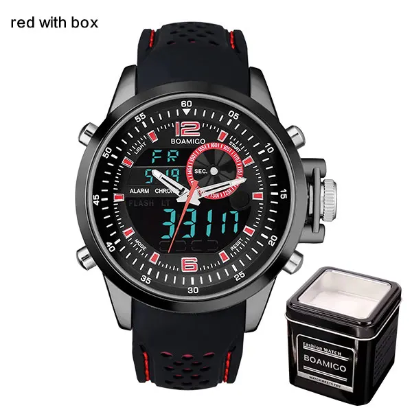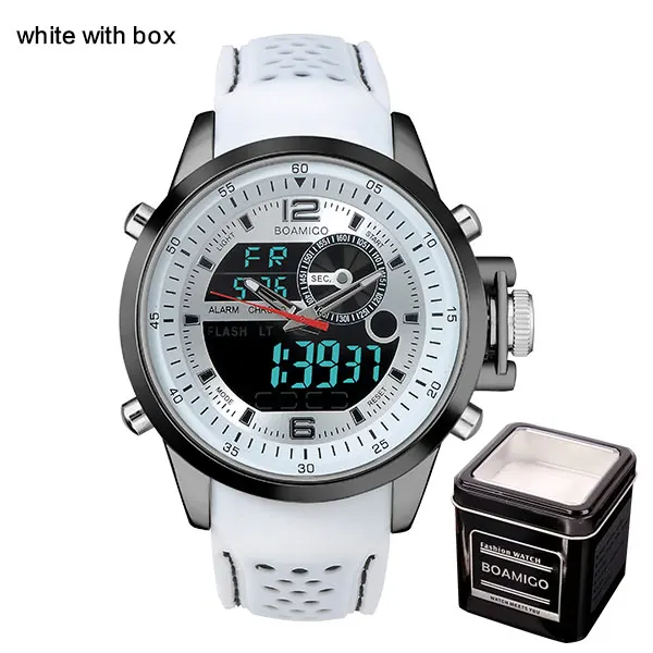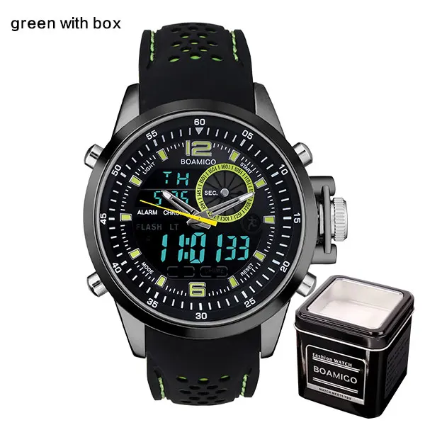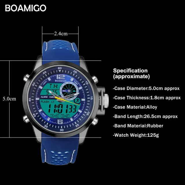 남성 듀얼 디스플레이 스포츠 시계 군사 쿼츠 시계 고무 밴드 BOAMIGO 브랜드 블루 LED 아날로그 디지털 손목 30 메터 방수 키 포인트: 1. 기능: 듀얼, 알람, stopwatches, 크로노 LED 빛, 날짜,, 달 2. 유형: 남성 스포츠 시계 3. 운동: 아날로그 디지털 듀얼 디스플레이 4. 스트랩 재질: 고무 5.30 메터 방수 6. 정확한 시간 7. 최고의 선물 크리스마스, 새해 생일 및 특징: 케이스 직경: 5.0 센치메터 약 케이스 두께: 1.8약 케이스 meterial: 합금 밴드 길이: 26.5 센치메터 약 시계 weigth: 125 그램 밴드meterial: 고무