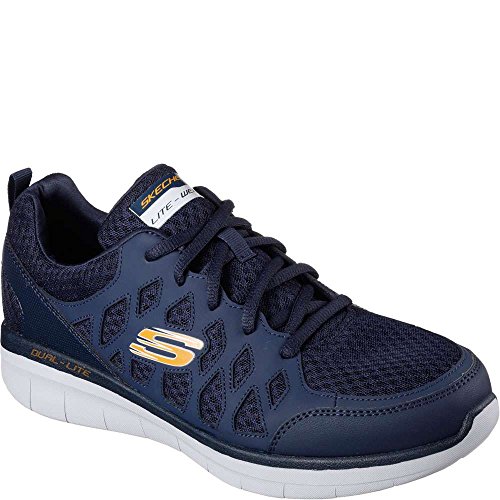 Binding : Apparel Product Description SKECHERS Men's Synergy 2_0 Peslier cross-trainer shoes feature a smooth action leather synthetic and mesh upper. Smooth synthetic overlays for added durability. Lace-up front for a secure fit. Smooth synthetic side and heel overlays. Soft fabric collar and tongue trim. Wraparound synthetic heel panel for added stability. Soft fabric shoe lining. Air Cooled Memory Foam cushioned comfort insole. Shock absorbing Dual-Lite® lightweight midsole for added comfort and range of motion. Rubber traction outsole. 0