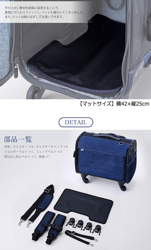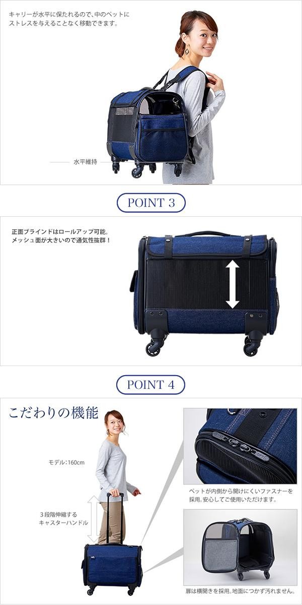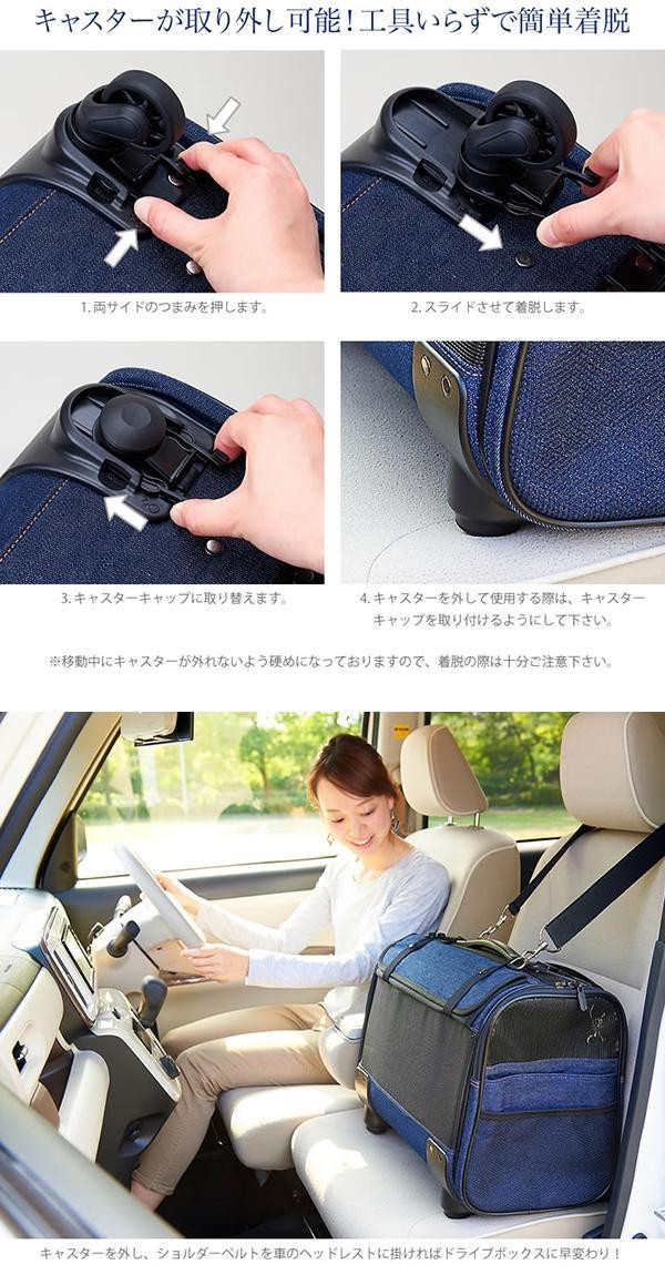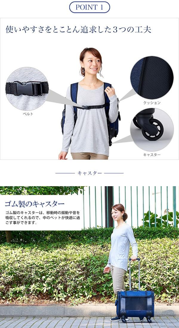 | リュック、手持ち、ショルダー、キャスターと4WAYで使用可能!!使いやすさをとことん追求し、背中への負担を軽減するためのクッションやペットの飛び出しを防止するリードなどの機能も充実しています。 |