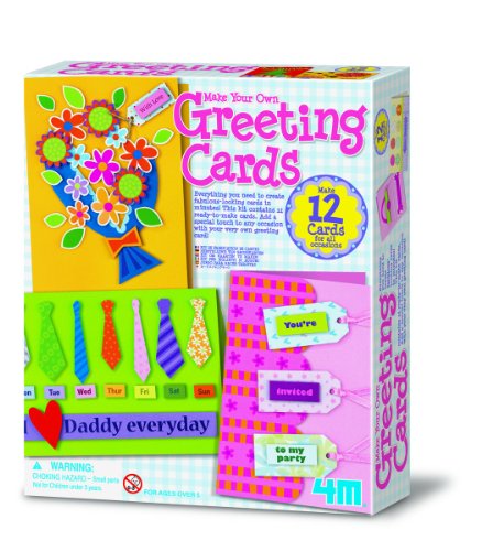-. Feature : Design and personalize up to 12 greeting cards for family and friends. / The kit includes blank cards, 12 unfolded envelopes, 6 sheets of pattern templates, alphabet stickers, ribbon and assorted decorations. / Also includes adhesive, double-sided tape and glue. / Detailed instructions for use and care are included. / Recommended for ages 5 years and up. / Challenge your child's imagination with 4M toys and kits. / 4M educational toys cover a wide range of educational subjects and include science kits, arts and crafts kits, robotics kits, and more. / 4M offers a wide range of toys and kits to let you build a clock, crochet a placemat, or turn your room into a planetarium--all in the name of making learning fun. / Create your own 12 greeting cards / Includes blank cards, 12 unfolded envelopes, 6 sheets of pattern templates, alphabet stickers, ribbon and assorted decorations / Also includes adhesive, double-sided tape, glue and detailed instructions