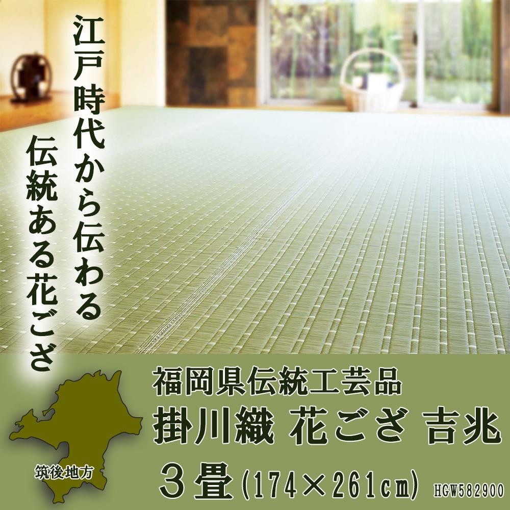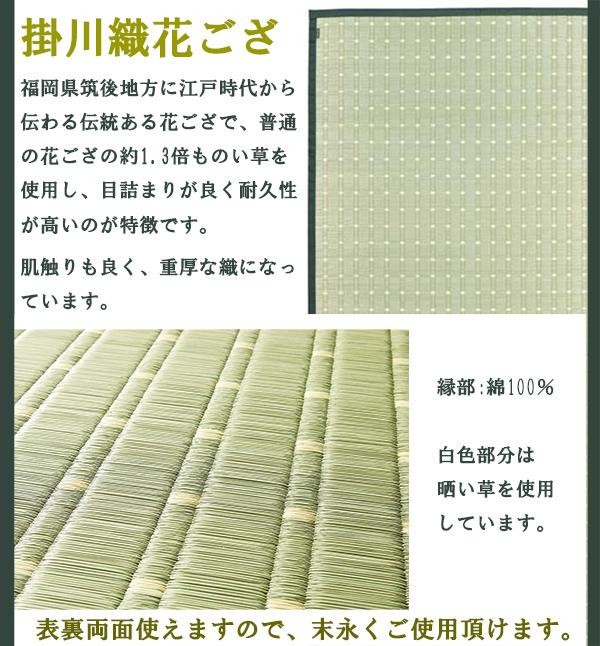 福岡県筑後地方に江戸時代から伝わる伝統ある花ござ。普通の花ござの約1.3倍ものい草を使用し、目詰まりが良く耐久性が高いのが特徴です。表裏両面使えますので、末永くご使用頂けます。 |
