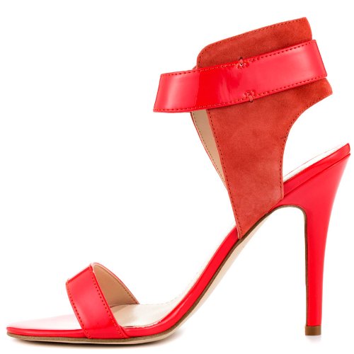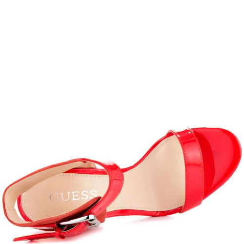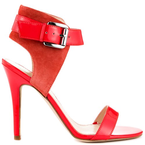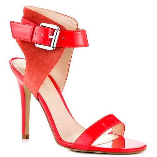 Head towards high fashion in the Heshia by Guess. This sleek sandal features a bright red suede with large buckle at the top and single strap vamp. A low 4 1/2 inch stiletto heel brings the perfect amount of height.