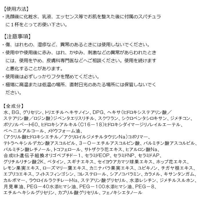 日本産の桜の花から抽出したエキスに、水溶性と脂溶性のビタミンC、脂溶性ビタミンのAとEを配合。お肌の奥まで浸透します。また、こっくりとしたコクのある潤いヴェールが、乾燥からお肌を守ります。敏感肌の方にも使いやすい無添加・無香料です。 |