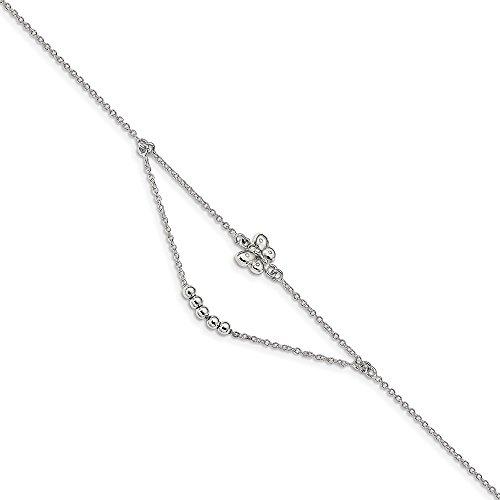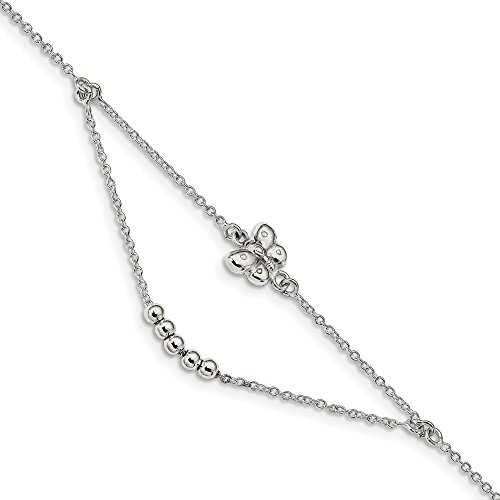 Anklets are a great way to add fun, flash and a feminine touch. This polished station and swag design made from sterling silver features a 1mm width solid link cable chain, 3mm width beads and a 9 x 10mm butterfly link station. It is adjustable in length from 9 to 10 inches, the drape length of approximately 20mm (3/4 inch) and closes with a spring ring clasp.Feature