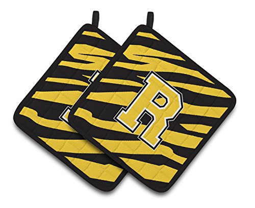 Caroline's Treasures Monogram Initial R Tiger Stripe - black Gold Pair of Pot Holders CJ1026-RPTHD, 7.5HX7.5W, Multicolor