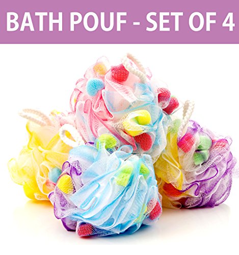 Bath Blossom Large Shower Sponge Pouf (4 Pack) - Bath Loofah Luffa Loufa - Great for Body Wash, Back and Body Scrubber - Exfoliate, Cleanse and Soothe Skin - Great Quality for Men and Women