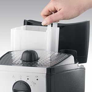 The water tank is simple to remove, refill and re-insert. Makes preparing espresso and clean up easy.