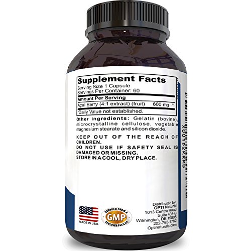 -. Brand : Opti Natural -. EAN : 0793579822240 -. Feature : ACAI BERRY - This purple berry is high in Vitamins and Minerals as well as being a strong antioxidant making it one of the greatest natural weight loss supplements / WEIGHT LOSS - Staying fit and keeping weight in balance can be challenging for many of us - luckily Acai Berry and its Pulp have been shown to be a great natural weight loss supplement / SUPPORT IMMUNE SYSTEM - Aside from being high on fiber Acai Berries are also used as Natural Detox and Cleanse encouraging good kidney and liver function and reducing toxins in the body / SKIN HEALTH - For centuries people have been taking Antioxidant rich herbs and foods to improve skin health - Acai Berry is high in Antioxidants which can have you looking and feeling great / GREAT FOR MEN & WOMEN - Acai Berry has been shown to have many Health benefits for both the body and the mind - all the ingredients in this supplement are 100% Pure and Natural -. IsAdultProduct : 0 -. Label : Opti Natural -. Manufacturer : Opti Natural -. MPN : LE -. PackageQuantity : 1 -. PartNumber : LE -. ProductGroup : Health and Beauty -. ProductTypeName : DIETARY_SUPPLEMENTS -. Publisher : Opti Natural -. Studio : Opti Natural -. Title : 100% Pure Acai Berry Extract Detox & Cleanse Weight Loss Supplement Increases Immune System Metabolism Boost Energy and Brain Function High in Antioxidants for Men and Women by Opti Natural -. UPC : 793579822240