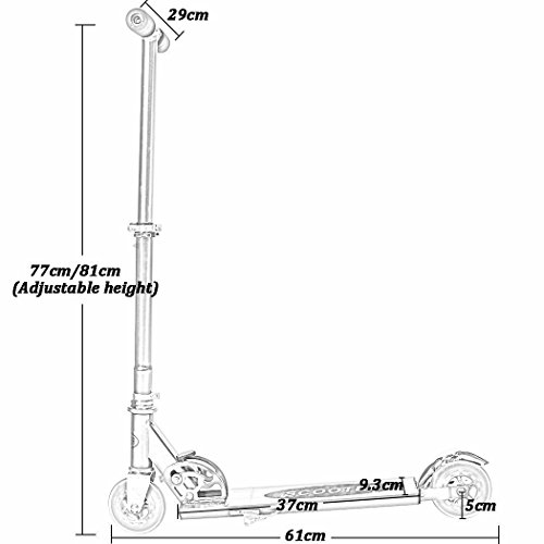 -. Feature : ✪ HEIGHT-ADJUSTABLE - Adjustable telescoping handlebar with soft hand grips and 3 level height adjustable, range 24.8-33.5 inch, Suit for kids 3 to 8 years old, The boy & girls scooter supports riders up to 176 LBS (80KG) / ✪ SOFT GRIP&PU WHEELS - With soft rubber comfortable hand grips, your hands will feel comfortable, not too pain. Sponge and folding handlebar, comfortable feeling. Reducing vibration and make a smoother ride / ✪ ESAY-FOALDING MECHANISM - No assembly request, the adult kick scooter suit for quick storage and transportation. It's the perfect and easiest way to commute. Perfect for all kinds of pavement, pebbles, grass, asphalt, road, square, etc. / ✪ ANTI-SKID DECK& ALUMINUM ALLOY FRAM - Anti-rust paint foot rear brakes with rear suspension brings the scooter to a speedy secure stop. Large aluminum reinforced brake pedal is easy to use for quick and firm breaking fast / ✪ Recommended for ages from 4 to 8(height: under 140mm); supports riders up to 176 pounds (80kg)