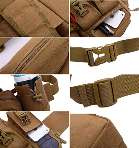 -. Feature : 1. PRODUCT STRUCTURE:The zipper pocket and two small pouches on the outside of the main bag, and one waterbottle pocket on the side of main pocket(the water bottle is not included). / 2. MULTIFUNCTION: Perfect design 600D nylon & silk canvas tactical?backpacks can also be used as messenger bags, shoulder bags and laptop rucksacks. / 3. PRODUCT PARAMETERS: 8.26" W x 7.1" H x 1.96" D, Strap length overall: 27.56inch /44.88 inch (Can be adjusted). Weight: 0.7 lb. / 4. QUALITY GUARANTEE: Scratch-resistant, good toughness; High strength nylon buckle, cold-resistant, high temperature resistant; High strength metal, double pull head, durability material. Nylon mesh straps, lined with breathable fabric. / 5. PERFECT FOR DAILY USE: The belt never runs down or up with adjustable buckle and expandable strap, while you are running,?hiking, camping, hunting, cycling, shopping, traveling or climbing etc. It's just a designed waist bag for men and women.