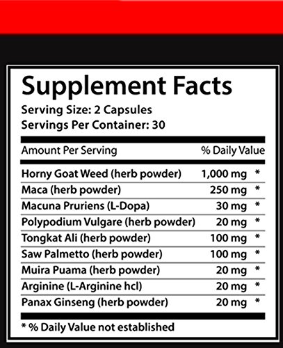 Product Description: Every Serving contains Horny Goat Weed (1000mg) with Maca (250mg) Tongkat Ali (100mg) Saw Palmetto (100mg) Macuna Pruriens (30mg) Polypodium Vulgare (20mg) Muira Puama (20mg) Arginine (20mg) Panax Ginseng (20mg)