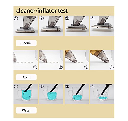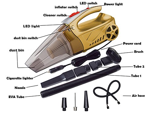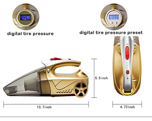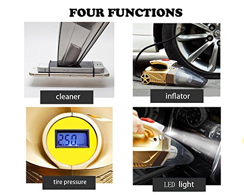 MULTIFUNCTION 4 IN 1 CAR VACUUM CLEANER: 1. Powerful Wet&Dry 12V 106W Car Vacuum 2. Tire Inflator, can rapid inflation help your inflate tires anytime 3. Digital tire pressure, tire pressure gauge prevents the over-inflation 4. Led Light assists dispelling the darkness.