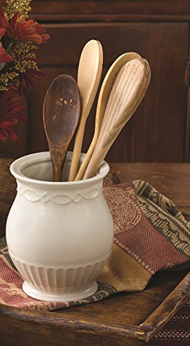 - Stoneware utensil crock measures 5 inches in diameter by 6.5 inches high.