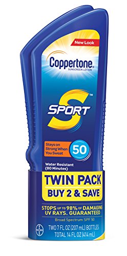 Whatever outdoor activity you're passionate about, Coppertone SPORT Sunscreen Lotion is on your team. Designed to stay on strong when you sweat, this high-performance sunscreen protects you from the sun with a durable and water-resistant formula (80 minutes) that leaves a light, breathable feeling on your skin. Delivering broad spectrum UVA/UVB protection, this sunscreen contains moisturizers and Vitamin E to refuel your skin's antioxidant defense. Depend on this tough sunscreen for outdoor activities where every moment counts, whether it's at the big game, the jobsite, running or cycling. This pack includes two 7-fluid-ounce SPF 50 sunscreen lotion bottles. Use and reapply as directed.Feature