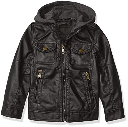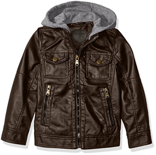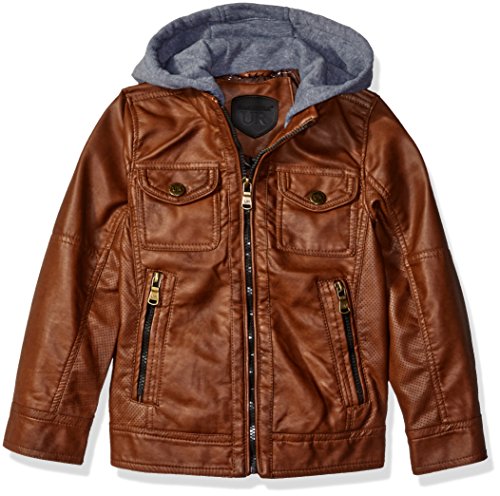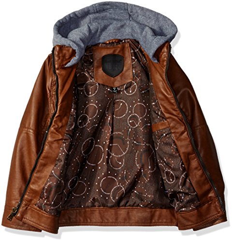 Urban Republic Big Boys' Faux Leather Jacket With Perforated Inserts and Fleece Hoodie, Cognac, 14/16