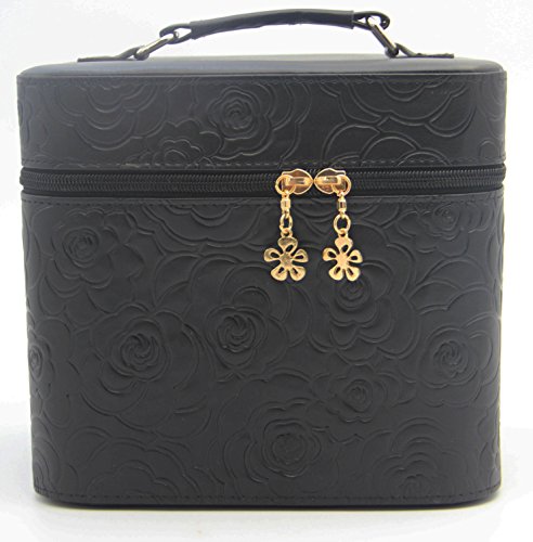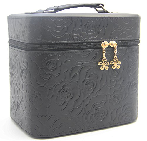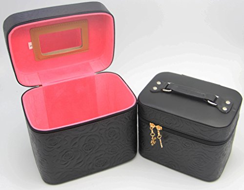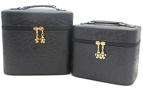 HOYOFO 2-Piece Set 3D Rose Pattern Large Makeup Case Travel Make Up Bag Cosmetic Train Cases,Black