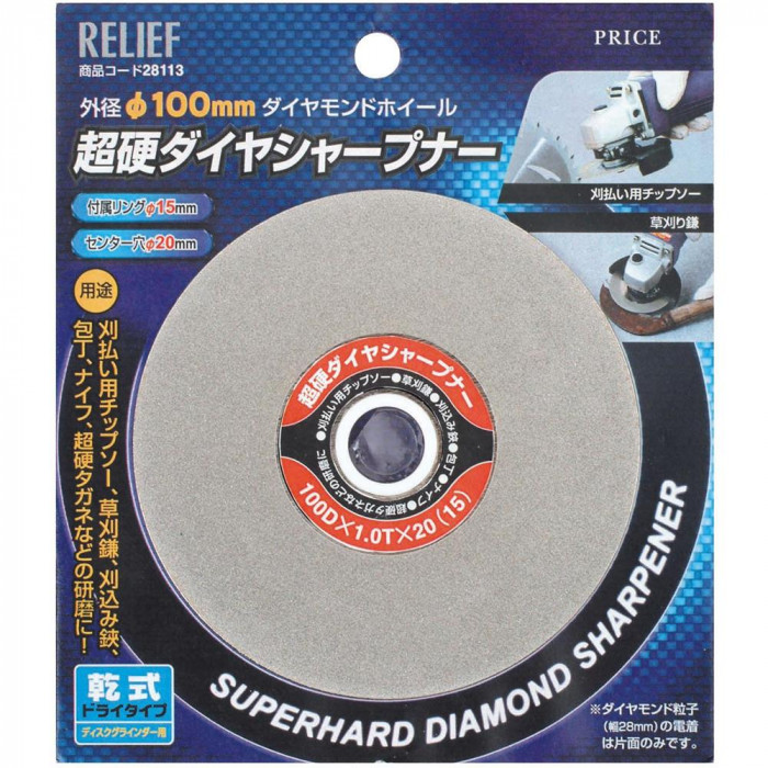 | 仕様 | ■ダイヤ部の幅:28mm(片面) ■外径:Φ100mm ■粒度:180 ■穴径:センター穴Φ20mm/付属リングΦ15mm ■用途:刈払い用チップソー鉄工、木工用チップソー・丸鋸・草刈鎌・農業機械刃物・ハサミ・包丁・ナイフ・超硬タガネなどの研磨 |