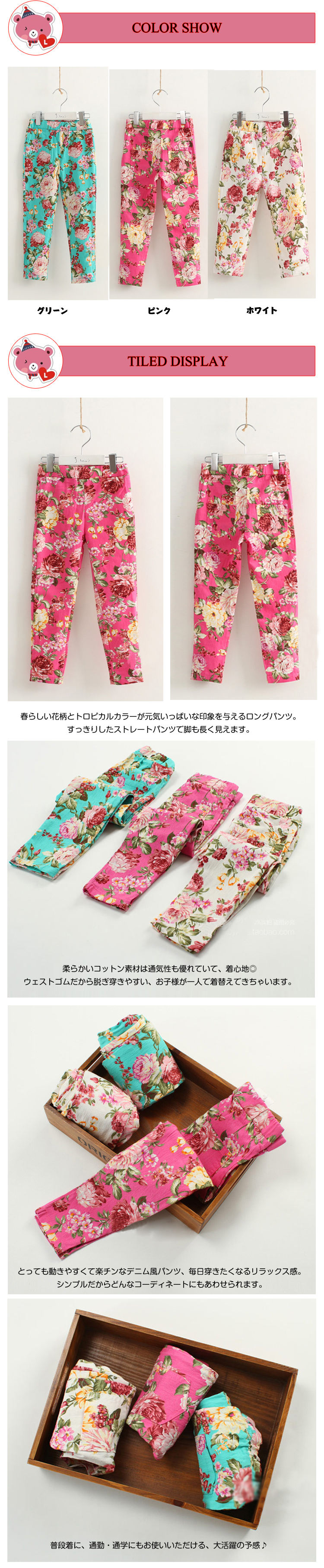| 春らしい花柄とトロピカルカラーが元気いっぱいな印象を与えるロングパンツ。すっきりしたストレートパンツで脚も長く見えます。柔らかいコットン素材は通気性も優れていて、着心地◎ウェストゴムだから脱ぎ穿きやすい、お子様が一人で着替えできちゃいます。とっても動きやすくて楽チンなデニム風パンツ、毎日穿きたくなるリラックス感。シンプルだからどんなコーディネートにもあわせられます。普段着に、通勤?通学にもお使いいただける、大活躍の予感? | |