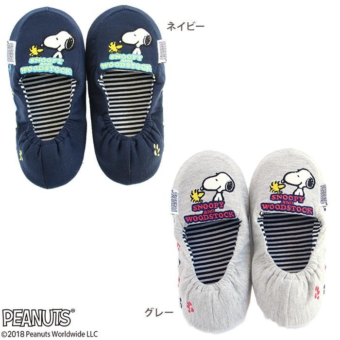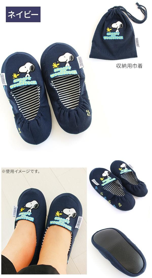 かわいいスヌーピーのアップリケが入った折り畳みスリッパ。旅行の際の機内や車内はもちろん、普段使いにもOK!!付属の収納用巾着に収納できるので、持ち運びにも便利♪ |