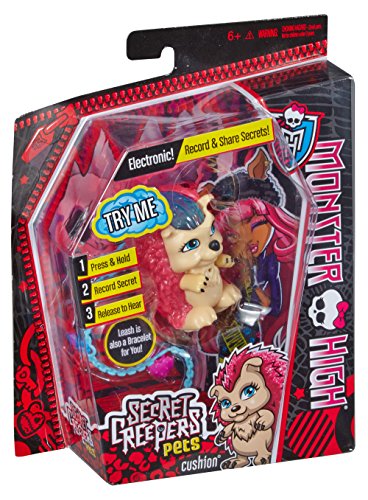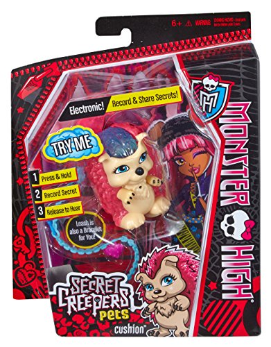 -. Binding : Toy -. Brand : Monster High -. EAN : 0885588800170 -. Feature : Cushion has come to life to keep your secrets! / Pop open their heads to reveal creepy cool secret-keeping features / Record secrets with the leash in and lock by removing / Leash doubles as a bracelet for the girl! / Transfer secrets between other Secret Creepers Pets (sold separately) by pressing the brain, then connect their paws together -. IsAdultProduct : 0 -. Label : Mattel -. LegalDisclaimer : 15% restocking fee -. Manufacturer : Mattel -. Model : BJR33 -. MPN : BJR33 -. PackageQuantity : 1 -. PartNumber : BJR33 -. ProductGroup : Toy -. ProductTypeName : TOYS_AND_GAMES -. Publisher : Mattel -. Studio : Mattel -. Title : Monster High Secret Creepers Cushion Figure -. UPC : 885588800170 -. Warranty : No Warranty