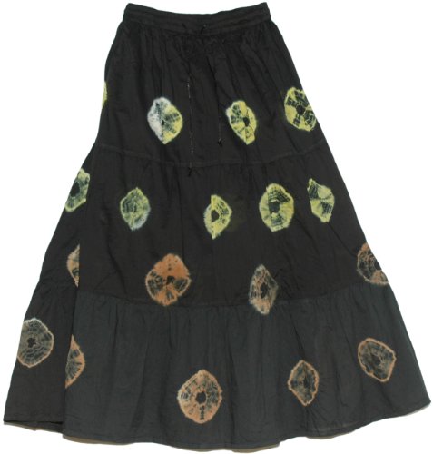 Binding : Apparel Product Description Black Boho Skirt with Rings - This outer universe black tiered long skirt is full with nebulae in yellow and orange tones, created using tie dye. Very unique, the tie dye pattern effuses a stylish image. This fascinating boho skirt is made of cotton - good for the season. It has a comfy elastic with drawstring on waist. Length: 35 inches ; Waist: 26 - 32 inches; Material: Cotton 0