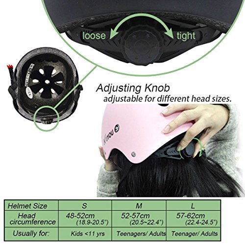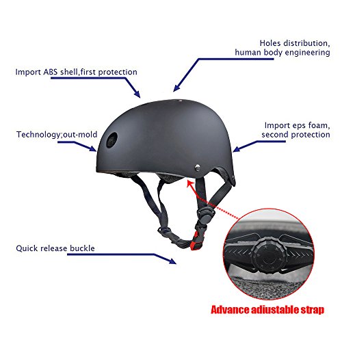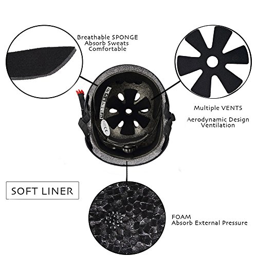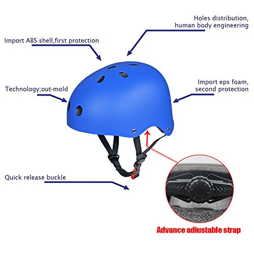 -. Feature : Quality Guaranty--- Conforms to EN1078, CE and CPSC Standards (This is the current European safety/manufacturing standard for helmets. The toughest testing requirements for helmets are currently imposed by CE-tests, including impact damping capabilities, effectiveness of the strap system as well as range of vision) / Adjustable Straps and Spin Dial ---The skateboarding helmets equipped with adjustable straps and spin dial for Adult /kids to adjust flexibly to get a better fit. / Ventilation--- As designed with 11 vents, special aerodynamic design, and the skate helmets help reduce sweating and feel cool even during intense body movement, which considered as cool helmets for skateboarding or roller skate. / Impact Resistance---The skateboard helmet adopts durable tough shell with soft liner which could absorb external pressure caused by crash in skating activities. Kids/adult wear the skateboarding helmets will feel much safer and more confident, and thus perform better in sports activities. / Multi Sports Gear ---As ideal skateboard accessories, the cool helmets are widely used in skating activities such as skateboarding, roller skating, inline skate, scooter, rollerblading, longboard and two wheel electronic board. As play great protective function during these activities, the skateboard helmets are considered as the best helmets for skating activities.