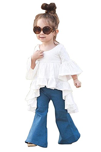-. Feature : Material: Cotton Blend + Denim / Occasion: Dressy, Everyday, Holiday / Season: SP.R.Ing, Fall,summer / Best gift for your girls,Perfect for daily wear,Christmas gift or taking photos / Package include:1*Girls White Ruffle Dress Top+1* Cute Jean Pants