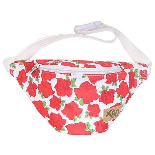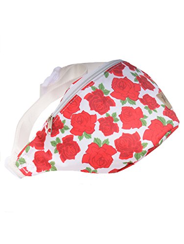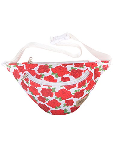 -. Feature : Fashionable waist pack features a floral design made up of roses. / Features two compartments that can be securely closed with zippers. / Perfect bag for concerts, festivals, hiking, traveling, bike rides, and many more activities. / Hip bag's adjustable strap can fit waists ranging in size from 26-38 inches around.
