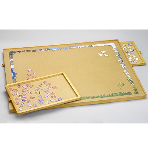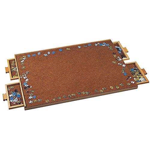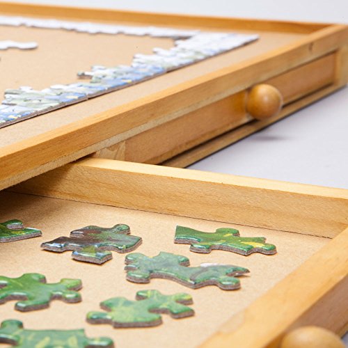 -. Binding : Toy -. Brand : Bits and Pieces -. EAN : 8139740472715 -. Feature : Unique sorting, assembly, and storage system for jigsaw puzzles. Keep your unfinished puzzles safe until next time. / This jigsaw puzzle organizer has four wooden-reinforced sliding drawers to sort and store your puzzle pieces. / Makes a special puzzle accessory gift for Christmas or a birthday. / Wood tones may vary. / Standard Size Wooden Puzzle Plateau fits most Jigsaw puzzles up to 1,000 pieces and measures 20½" x 28½". -. IsAdultProduct : 0 -. Label : Melville Direct -. Manufacturer : Melville Direct -. MPN : 47271 -. PackageQuantity : 1 -. PartNumber : 47271 -. ProductGroup : Toy -. ProductTypeName : TOYS_AND_GAMES -. Publisher : Melville Direct -. Studio : Melville Direct -. Title : Bits and Pieces - Standard Size Wooden Puzzle Plateau-Smooth Fiberboard Work Surface - Four Sliding Drawers Complete This Puzzle Storage System