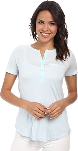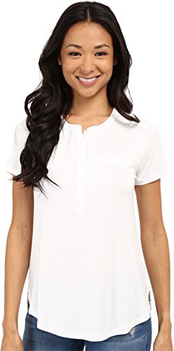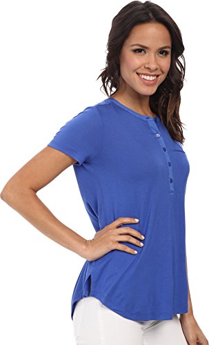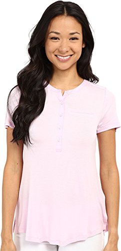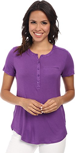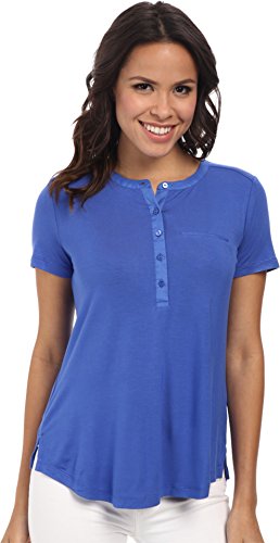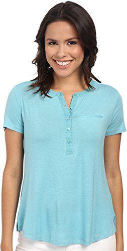 Short-sleeve top in a soft stretch rayon knit. Five-button henley neckline. Woven trim on the neckline and placket. Chest welt pocket. Pleats cascade down the center back from the collar. Straight back yoke. Straight front hem. Split side seams. Curved back hem. 96% rayon, 4% spandex;