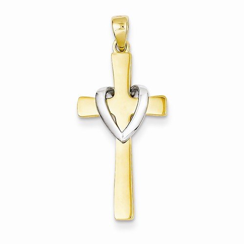 Solid 14k Yellow & White Two Tone Gold Polished Love Heart Cross Crucifix Pendant (28mm Height)