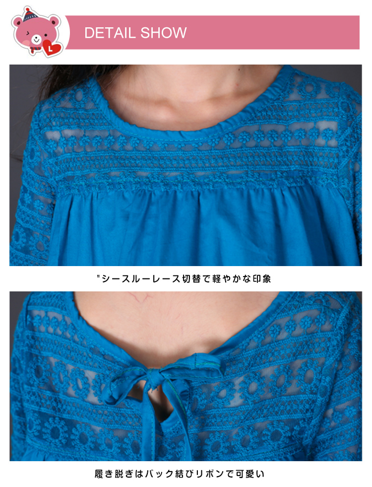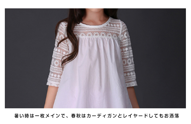 | 今季大人気のシースルーレース切替ワンピースニの腕を完璧に隠せる5分袖が嬉しいpointほどよい丈感で夏から秋まで長い時間愛用されるから重宝します。胸もとギャザーが寄せられ、可愛いAラインを生み出し、リッチな表情◎綿90%の上品素材で仕立てて、肌触り優しく着心地抜群デイリー使いはもちろん、ちょっとお出かけにもぴったり | |
