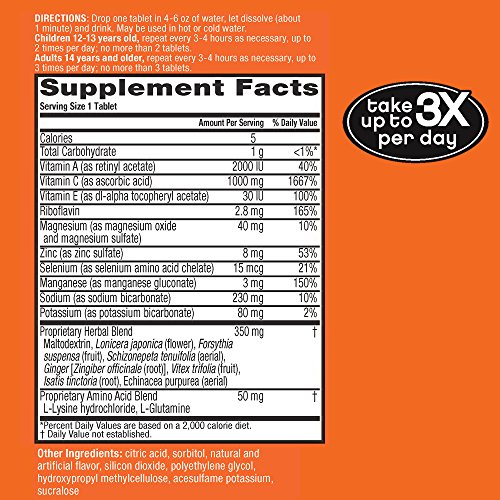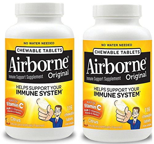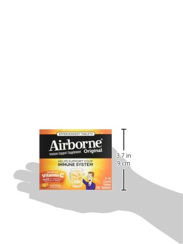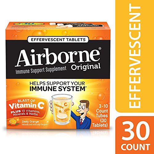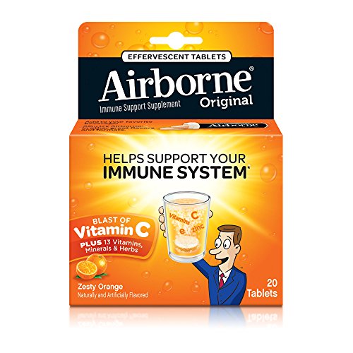 Airborne Effervescent Tablets provide real immune support in a great-tasting and fast absorbing formula. Each serving (1 tablet) delivers a blast of 1000 mg of Vitamin C plus 13 other immune system supporting vitamins, minerals, and herbs, including Echinacea, ginger, and other herbal extracts from whole plant materials.* Adults and Children over 12 years old, simply drop 1 tablet in a glass of water or favorite beverage, let dissolve (about 1 minute) and drink. Can repeat every 3-4 hours as necessary. Take up to 3X per day as needed. Gluten Free and No Preservatives. Visit AirborneHealth.com to learn more.Feature