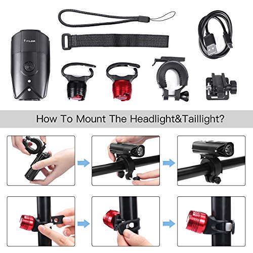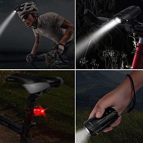 What's included: 1x Bicycle Headlight 1x Strap Mount 1x Helmet Holder 1x USB Charge Cable (60cm) 2x Bicycle Tail Lights 4x Button Cells for Tail Lights 1x Hand Band 1x User Manual