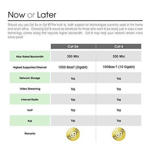 Industry standard ANSI/TIA-568-C.2, Cat 6, ETL verified cables with high compliance RJ45 (8P8C) snag-less connectors and molded strain relief boots. Bandwidth rating of up to 550 Mhz ensures compatibility with Ethernet 10BASE-T, 100BASE-TX(Fast Ethernet), 1000BASE-T (Gigabit Ethernet), 10GBASE-T (10-Gigabit Ethernet), Peer-to-Peer, and any other applications that utilize networking cables including telephony, home automation and long distance video transfer technologies like HMDI over Ethernet. Use to connect any networkable device with RJ45 connection including PC's, laptops, servers, printers, NAS storage devices, VOIP, Power over Ethernet (PoE), DVR's, etc.