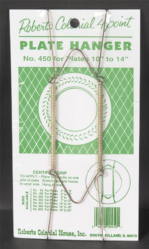 -. Binding : Kitchen -. Brand : Roberts Colonial 4-point -. Color : Copper -. EAN : 0042149004501 -. Feature : For Plates 10" to 14" -. Label : Roberts Colonial House, Inc. -. Manufacturer : Roberts Colonial House, Inc. -. Model : 450 -. PackageQuantity : 1 -. ProductGroup : Home -. ProductTypeName : HOME -. Publisher : Roberts Colonial House, Inc. -. Studio : Roberts Colonial House, Inc. -. Title : Roberts Colonial 4-point Plate Hanger No. 450 for Plates 10" to 14" -. UPC : 042149004501