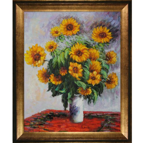 Hand painted oil reproduction of a famous Monet painting, Sunflowers. also known as Tournesols . The original masterpiece was created in 1881. Today it has been carefully recreated detail-by-detail, color-by-color to near perfection. Why settle for a print when you can add sophistication to your rooms with a beautiful fine gallery reproduction oil painting? While Monet successfully captured life's reality in many of his works, his aim was to analyze the ever-changing nature of color and light. Known as the classic Impressionist, Monet cannot help but inspire deep admiration for his talent in those who view his work. This work of art has the same emotions and beauty as the original. Why not grace your home with this reproduced masterpiece? It is sure to bring many admirers! Frame Description: Athenian Gold Frame - Antique Gold Finish.Feature