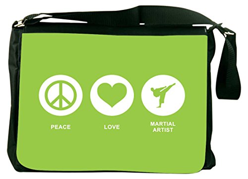 Studio : Rikki Knight LLC Publisher : Rikki Knight LLC Binding : Office Product Product Description Whether from home to the office, on a business trip or to school, the Peace Love Martial artist Lime Green color laptop bag notebook bag messenger bag school bag keeps you comfortable and your cargo safe and sound - this bag features pockets on the outside below the flap for your cellphone, pens, iPod, notebook etc. And also a zippered compartment on the inside, with plenty of space to store your textbooks, folders, files, etc. And up to a 14 inch laptop (laptop sleeve sold separately) - the vibrant image on the front is professionally printed and will not fade or peel with time and this bag will surely be an eye catcher wherever you go with it. Disclaimer: all images are printed directly into the material - the Texture of the image will always be a flat surface. Any images that appears to be 3D, textured, or glittery are flat printed images. 0