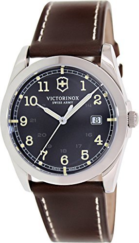 Command attention when you step into the room with this brilliant Victorinoxâ"¢ timepiece on your arm. Stainless steel case. Leather band features an adjustable buckle closure. Round face. Three-hand analog display with quartz movement. Dial features contrasting hour markers, Victorinox detailing, a minute track, an army time track, and a date display window. Water resistant 100m. Imported.