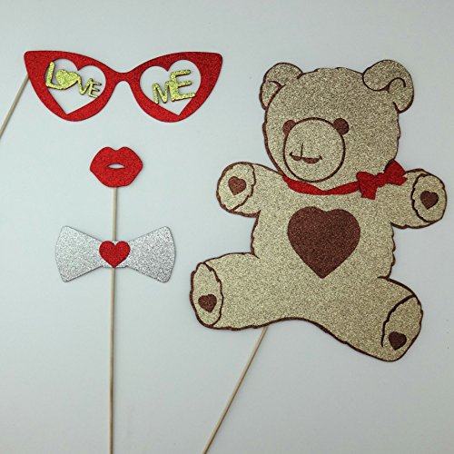 4 Pc Photo Booth Party Props Mustache on a Stick Valentines Day Heart Glasses Teddy Bear