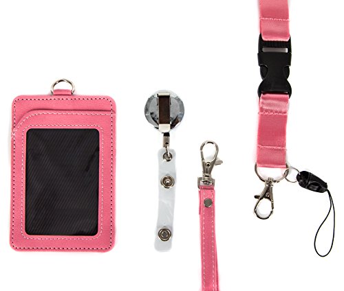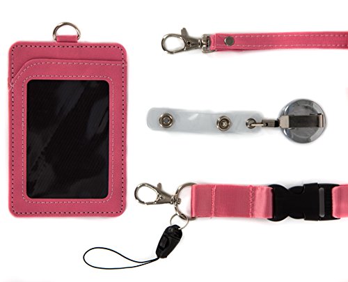 4 in 1 Leather ID Badge Holder with Retractable Reel, Lanyard Clip and Leather Necklace Strap - Double Sided, Two Back pocket - Carries: ID, Credit Cards, Keychain, Money Wallet and Phone - Pink Love