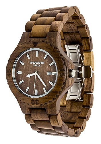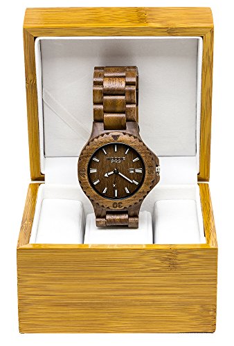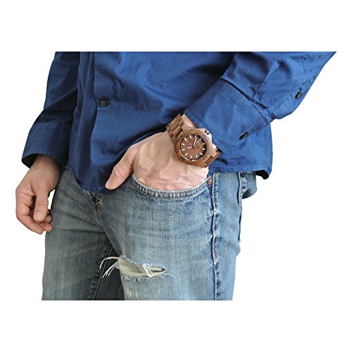 Handmade men's analog walnut wood watch made with 100% high quality natural walnut wood from raw materials. Each piece is original because no two pieces of wood are exactly the same. Your walnut wood watch will also come with an elegant wooden box. The watch face has a diameter of 50mm and has quartz movement (Battery powered) with date and time. This comes with a high end double fold stainless steel clasp. Although this is considered a mens watch because of the size, women can wear it too. If you are not satisfied with your walnut wood watch return it for a full refund. They are amazing gifts and are a great conversation starter! This is something they are not going expect but will love. Sizing the band is easier than you would expect. We recommend taking it to a watchmaker/jeweler to remove links or by doing it yourself. In Youtube search for "Woodie Specs" for simple sizing instructions. Disclaimer: If you are allergic to any of the wood that we use, types of metal (Which might be in the clasp), or wood lacquers we recommend not purchasing our products.Feature