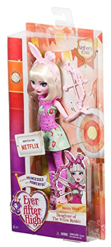 -. Binding : Toy -. Brand : Ever After High -. EAN : 0887961370034 -. Feature : Accessorized with a bow-and-arrow piece, the Ever After High archery dolls are aiming high / Bunny Blanc doll has a pretty pink bow with arrow that she can hold in her hand. / She's ready for practice dressed in a blue training outfit with a colorful floral P.R.Int and purple textured leggings / Pink cutout boots and elaborate body jewelry are right on point / A headband with bunny ears is a signature piece for this punctual Wonderlandian -. IsAdultProduct : 0 -. Label : Mattel -. Manufacturer : Mattel -. Model : DVH81 -. MPN : DVH81 -. NumberOfItems : 1 -. PackageQuantity : 1 -. PartNumber : DVH81 -. ProductGroup : Toy -. ProductTypeName : TOYS_AND_GAMES -. Publisher : Mattel -. Studio : Mattel -. Title : Ever After High Archery Bunny Doll -. UPC : 887961370034 -. Warranty : 1 year warranty against manufacturer defects