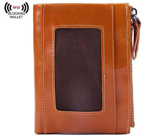 -. Feature : SAFETY & PRIVACY - Our wallets are equipped with advanced unique proprietary blocking material , which blocks RFID signals and protects the valuable private information stored on RFID chips from unauthorized scans. This keeps your vital information in Your Credit cards, Debit cards, Banking Information, Smartcards, RFID driver's licenses and other RFID Cards from being stolen. / GENUINE LEATHER - Made of high quality Cowhide Genuine Leather with waxed finish. Compact yet small enough to put into your bag. Comes With 6 Credit card slots and 1 photo slot, 1 ID window, 2 coin zippered pockets, 1 full-length compartment to put money, 1 long zippered pocket for change and coin inside, 1 pocket with snap button for change. Roomy enough for fitting plenty of cards, change and some bills, Coins, keep them well organized. / CLASSIC FUNCTIONAL DESIGN - Measure 4.72" x 3.66" x 0.59" in. As the bill section can hold up 40 pieces of dollar bills. And the snap stays shut. Carrying the items necessary while travel, holds a lot without being bulky. Best choice for avoiding bulky looking wallets. Longer time we use, nicer it becomes. / FUNCTIONAL FOR YOUR BUSY LIFE - Use them every day to Shield against unauthorized RFID, NFC scans as reported in the media -- Use them if you spend time vacation or live overseas -- Protect yourself from strangers in public places -Great while using public transport or just in public places / NO HASSLE MONEY BACK GUARANTEE - We know you'll love our wallet as much as we do, If for any reason you're not 100% SATISFIED, let us know and our customer service team will make things right: full refund or a free replacement, whichever you prefer.